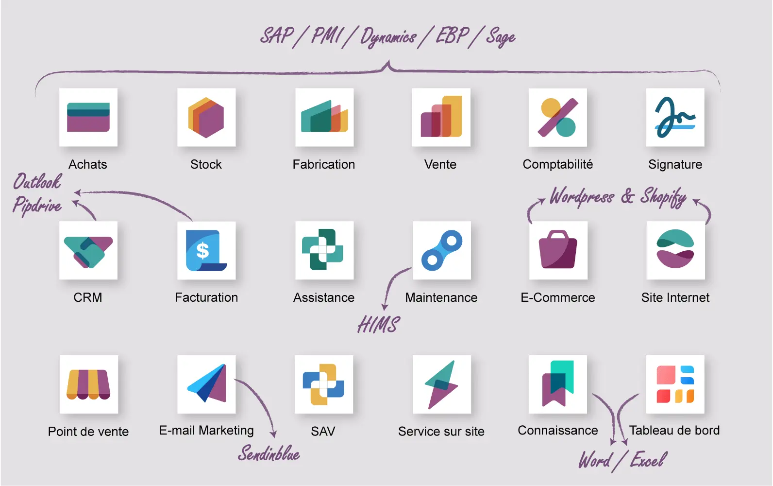 Un ERP (Enterprise Resource Planning), ou PGI en français (Progiciel de Gestion Intégré), est un logiciel centralisé qui permet de gérer l’ensemble des processus d’une entreprise à travers une base de données unique. Il regroupe plusieurs fonctions comme la comptabilité, la gestion de la facturation électronique, les ventes, le CRM, les achats, les stocks, la production, la logistique ...